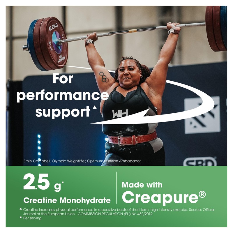 Product DescriptionMeet the Optimum Nutrition Creatine 2500 Caps: creatine monohydrate capsules designed for professional and amateur athletes looking to increase performance in short-term high-intensity exercises. This highly-researched and effective food supplement, in easy-to-swallow capsules, provides 2500 mg of Creapure creatine monohydrate per serving. Creatine is a naturally-occurring compound found in the brain and muscles. While we make creatine in the body and consume it through meat and fish, additional intake is necessary to increase creatine stores in the body to support performance during high intensity activity. The ON creatine capsules are specifically designed to disintegrate quickly to allow maximum absorption into your system. To achieve optimum results, take two capsules per day with your favourite sports drink or protein shake. Optimum Nutrition Creatine 2500 Caps can assist with increasing performance (when consuming creatine at 3 g per day*) and are taken alongside a high-intensity activity, such as a CrossFit workout, bodybuilding strength training or any intense endurance session. *Source: Official Journal of the European Union - Commission Regulation (EU) No 432/2012 of 16 May 2012 establishing a list of permitted health claims made on foods, other than those referring to the reduction of disease risk and children's development and health.IngredientsCreatine Monohydrate as Creapure, Gelatine Capsule, Anti-Caking Agents (Magnesium Salts of Fatty Aids, Silicon Dioxide), Rice Powder.DirectionsTake 2 capsules with a meal twice daily. DO NOT EXCEED DOSAGE. KEEP OUT OF REACH OF CHILDREN.Safety WarningFood supplements are not to be used as a substitute for a varied diet. Do not exceed recommended daily dose. Keep out of reach of childrenBox ContainsCreatine 2500 (200) StandardManufacturer Contact Information4 Waterside, Dublin 24, Ireland