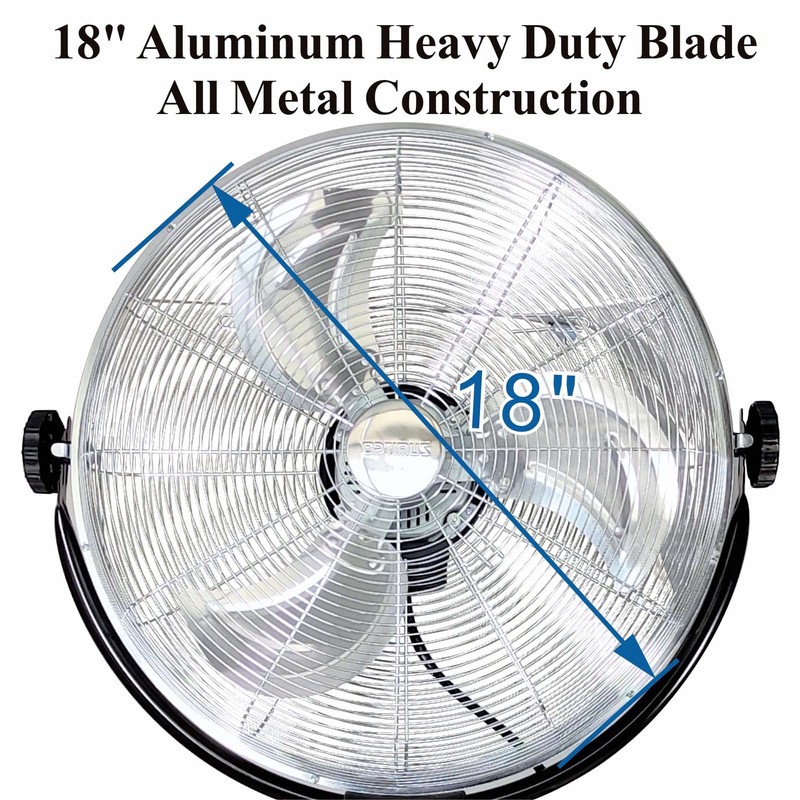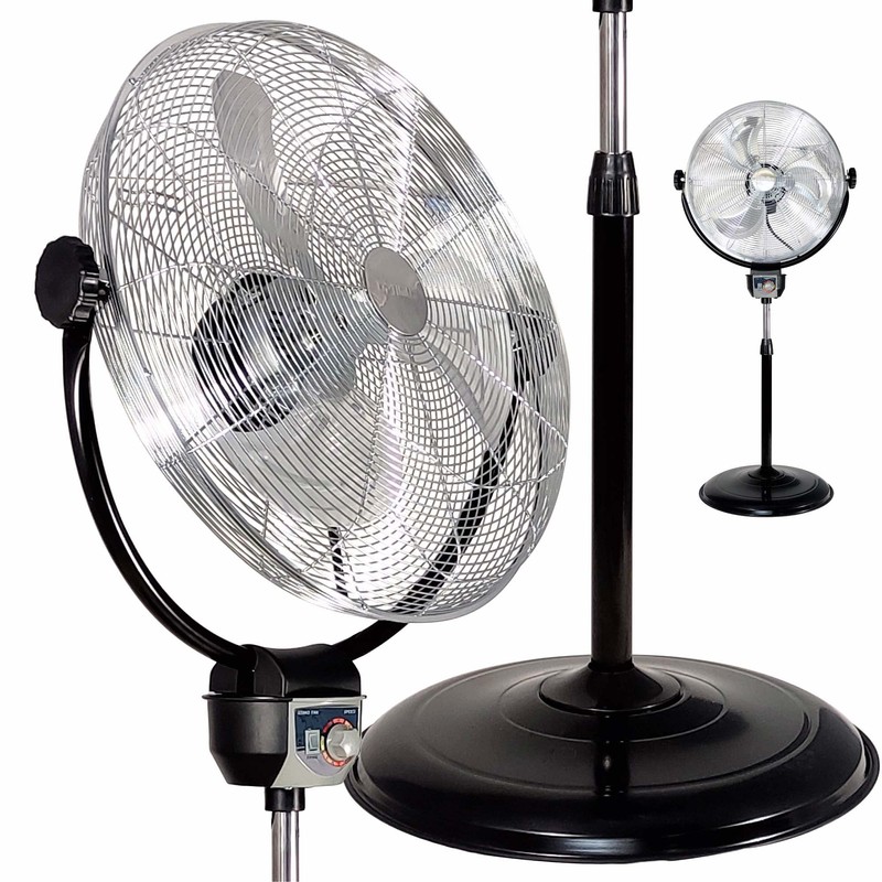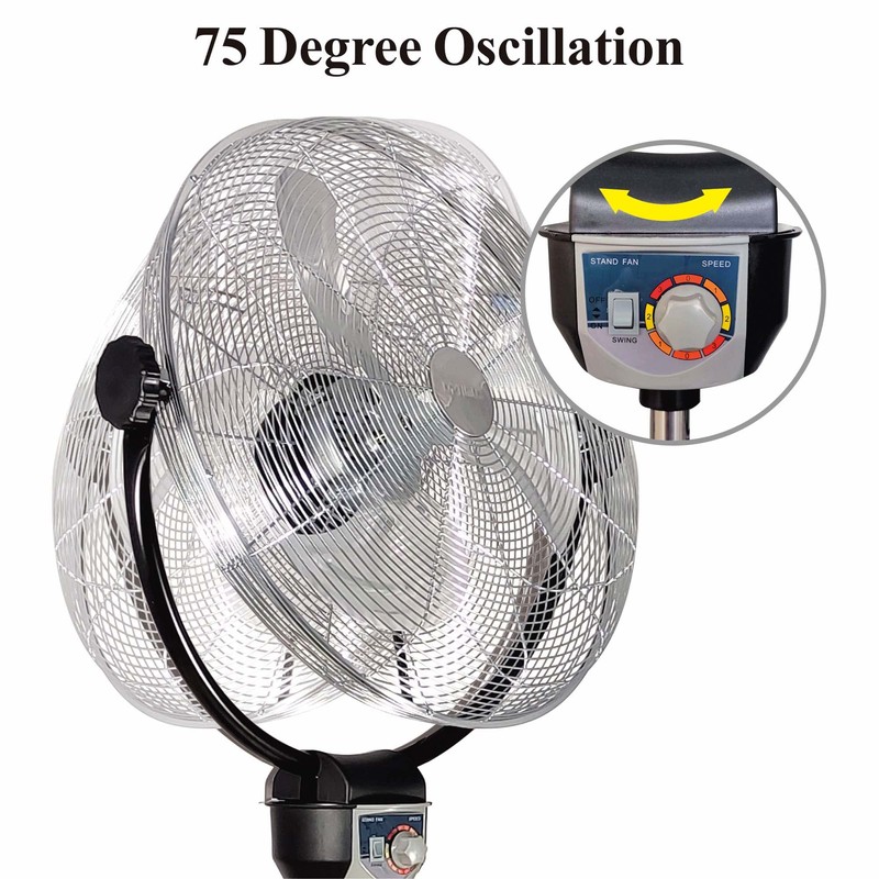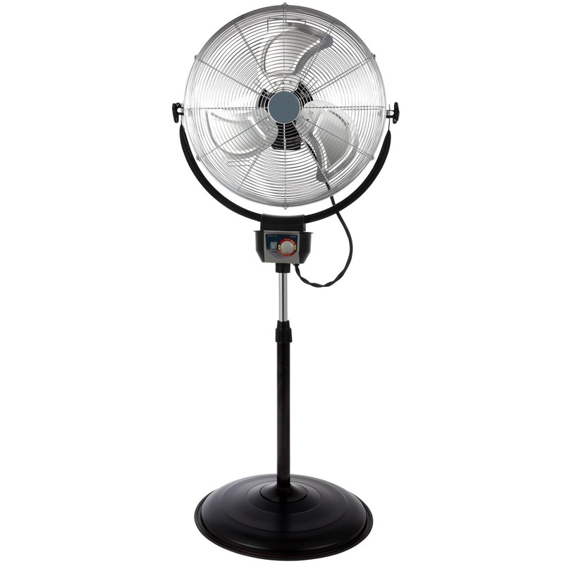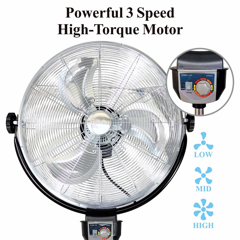Need big cooling on the go? The Optimus 3-Speed 20-In. Industrial-Grade High-Velocity Oscillating Stand Fan is a smart, safe, and convenient way to cool down during hot summer months. It features a powerful high-torque motor, all-metal construction, adjustable height, and a heavy-duty aluminum 20-in blade. The head tilts up to 360° so you can achieve max air circulation while the fan itself provides 75° of oscillation and the stable base keeps the fan firmly in place. The reinforced chrome wire grille keeps objects away from the blade. This high-velocity oscillating stand fan is ideal for fast, space-cooling relief in garages, shops, warehouses, exercise rooms, and outdoor workspaces and patios.