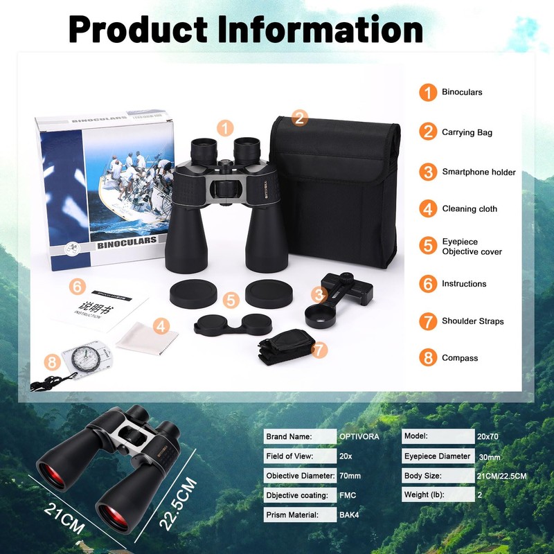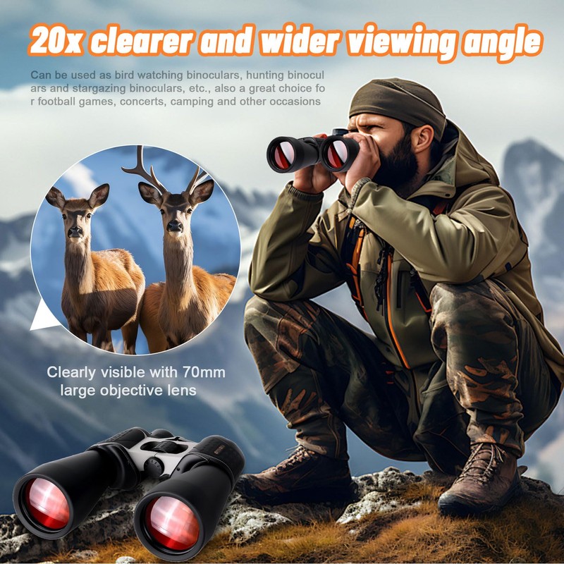 - [Clearer and Larger Viewing Angle】This binoculars for adults high powered is equipped with 20x magnification,you can get a farther and clearer view through the telescopes.70mm large telescopio lens,provide a larger image,see more comprehensively,very suitable for use as an bird watching binoculars for adults,binoculars for hunting,telescope for stargazing to use.