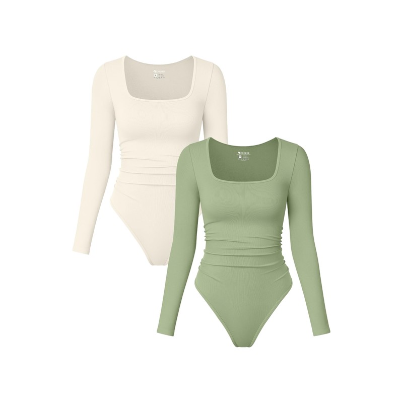 OQQ Womens 2 Piece Bodysuits Long Sleeve Square Neck Ruched Stretch Fitted Bodysuits Pea green Beige