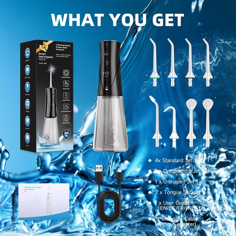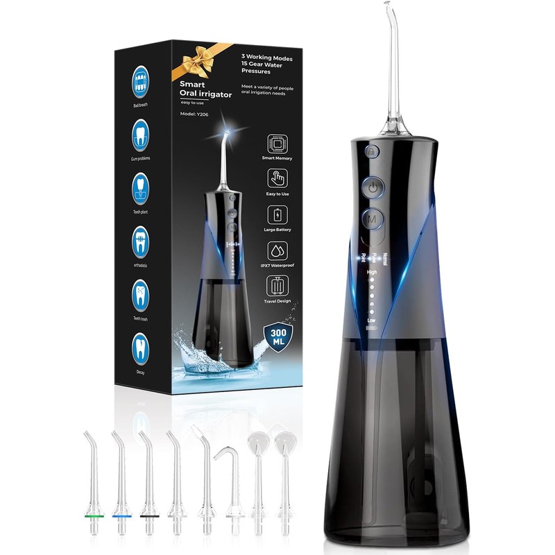 Oral Irrigator, Wireless Electric Tooth Cleaner, Dental Irrigator, Water Flosser, 3 Modes & 5 Intensities with 8 Nozzles, 300 ml Water Tank, USB-C Rechargeable, PX7 Waterproof Mouth Cleaner, Black