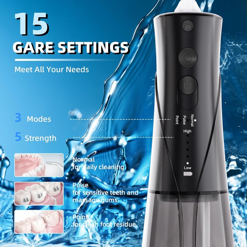 - 15 optional modes: this wireless water flosser has 3 modes and 5 water pressure levels, a total of 15 optional modes that allow personalised deep cleaning. The choice of 5 intensity settings benefits those looking for a gentle and sensitive cleaning, as well as those who want a thorough and powerful cleaning. It also has a 2-minute timer and a memory function. Tip: keep a large mouth full of water in the mouth before use.