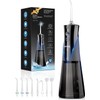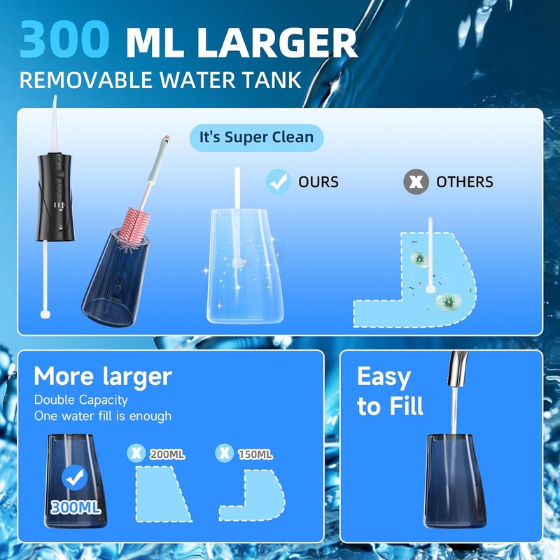 - 300 ml removable water tank and IPX7 waterproof: the removable 300 ml water tank with the gravity ball ensures sufficient and uninterrupted oral hygiene. 2 filling options with large opening for easy pouring and regular cleaning to prevent water residue. The dental shower water flosser is made of food-safe material, IPX7 waterproof, washable, so you don't have to worry about water spilling and mess in the bathroom. Please remember to cover the charging port tightly when you use.