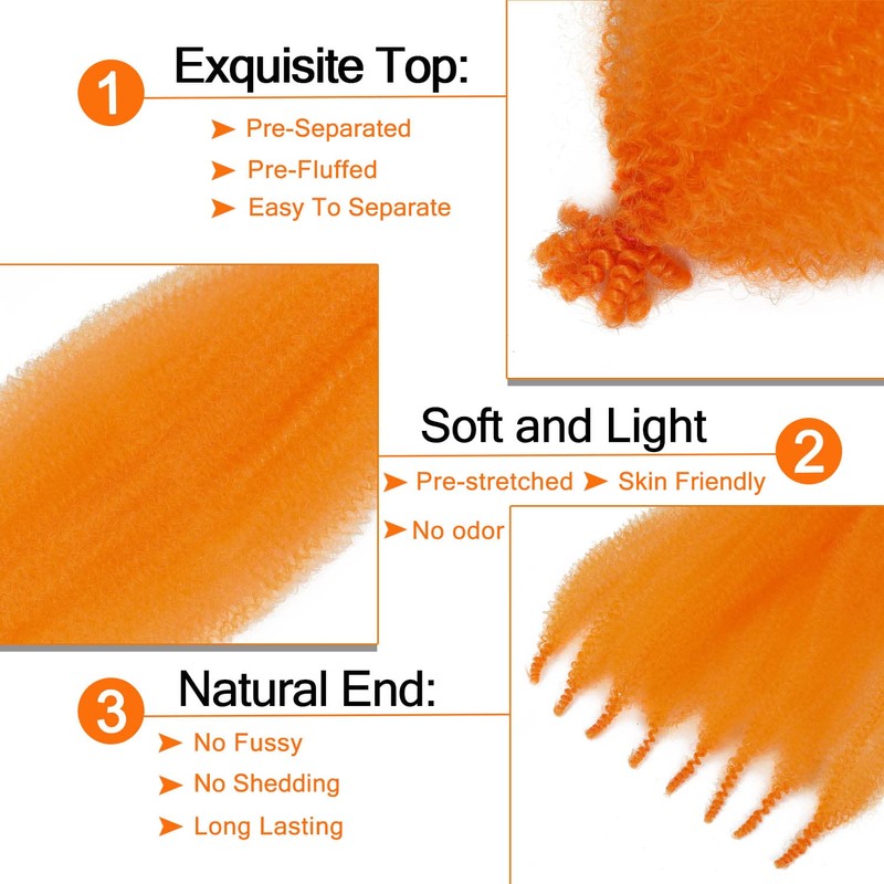 - 【Hair Advantage】 : Our Springy Afro Twist Hair Orange is Soft Texture and Super Lightweight, Fluffy, No smell, No Shedding, No Tangle, No Itch, Long-lasting, Natural & Stylish Looking. Matches your kinks and curls