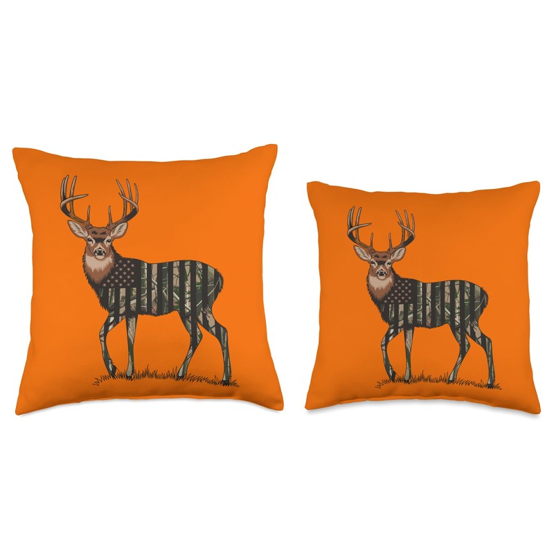 Orange Camo Deer American Flag Hunting Men Dad Deer Hunter Throw Pillow