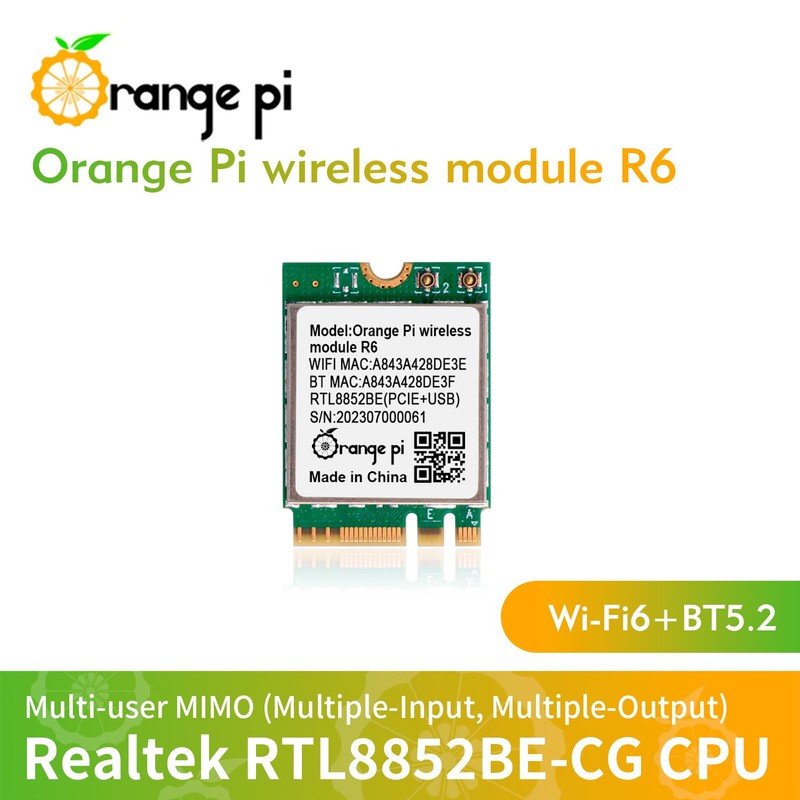 • Orange Pi wireless module R6 for Orange Pi 5 Plus is a highly integrated Wi-Fi6+BT5.2 module with PCle M.2E-KEY interface,Multi-user MIMO (Multiple-Input,Multiple-Output),and WLAN PCI Express network interface controller.