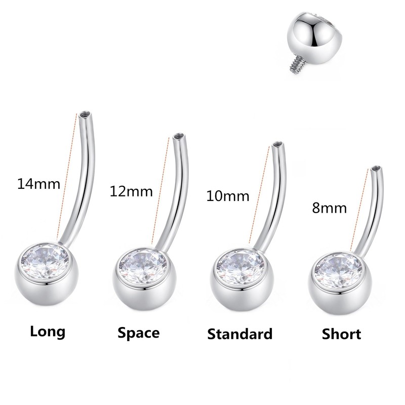 - Sold Individually. Size: Bar Thickness: 14G(1.6mm) Bar Length: 10mm(25/64”), Top CZ: 3.5mm, Bottom CZ: 6mm This is an Internally Threaded belly ring which features a round CZ gem at the top and bottom of the jewelry, giving it a very beautiful and sparkly outlook. Suitable for different occasions.High quality titanium, not easy to deform, healthy for those who are sensitive to other metals.