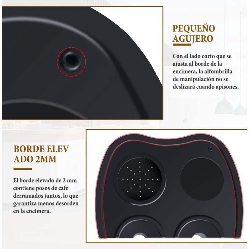 Tu tamper tendrá un espacio designado en tu cocina y utilizarás la alfombrilla como una alfombrilla de presión cuando prepares espresso. La alfombrilla es extra gruesa y extra firme. Y la hendidura redonda que sostiene el tamper tiene pequeños ""brotes"" en su superficie que le permiten eliminar algunos de los residuos de su tamper al girarlo. Aplicable a su vida diaria, como la cocina, la panadería, el salón de té, la cafetería, la oficina, etc.