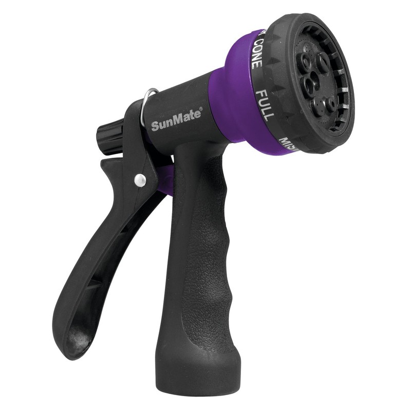 The Orbit Hose-End 7-Pattern Plastic Turret Nozzle is a rear-trigger nozzle with seven spray patterns for a variety of watering needs. The spray options include: Center, Cone, Flat, Flood, Jet, Mist, and Shower. The soft touch dial guard makes it easy to select patterns even when wet. One handed rear trigger flow control modifies water pressure, allowing a quick adjustment to the flow of water without going back to the faucet. A lock-on clip on the trigger holds it in place, allowing continuous water flow which helps reduce hand fatigue. The Turret Nozzle comes in blue, red, green and purple.