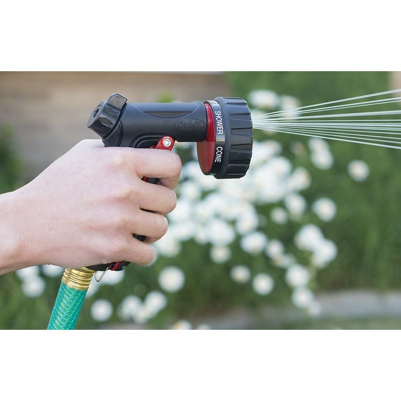 The Orbit pro Flo 7-Pattern Turret front trigger nozzle features unique flow- through design that maximizes water pressure. This nozzle offers a choice in spray patterns; find the right one for every task in the home & garden, from a gentle rain-like shower for gardens to a powerful jet spray perfect for clearing away debris. To modify water pressure, a front trigger allows a quick adjustment to the flow of water without going back to the faucet.