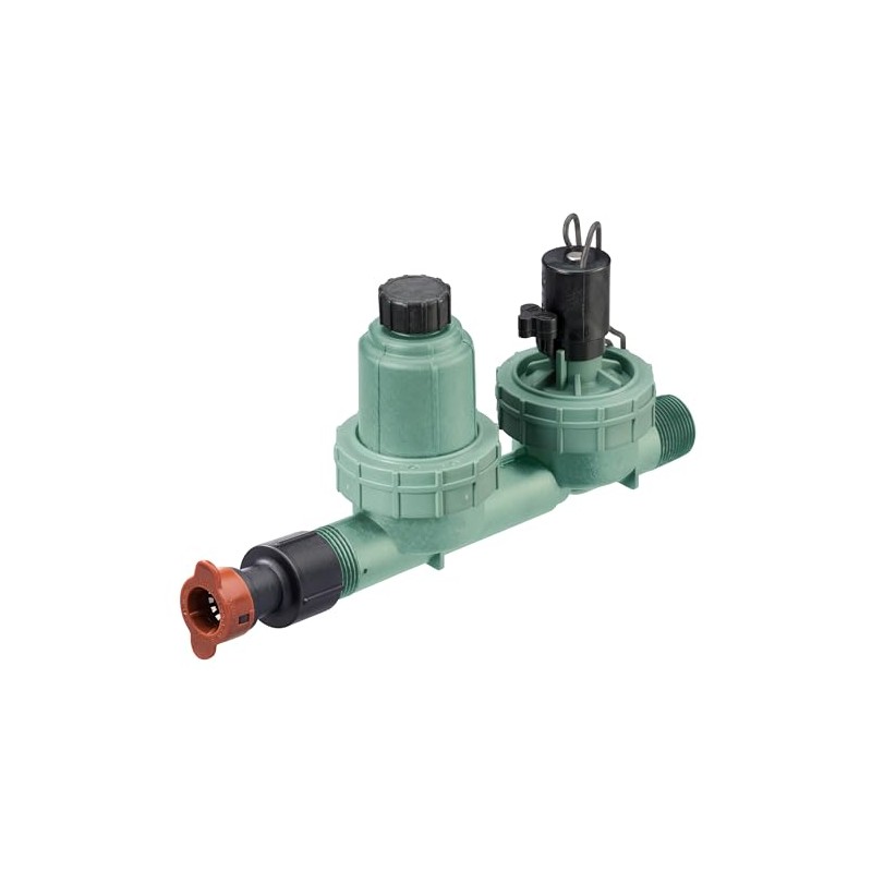 The 4-in-1 drip valve is a combination automatic jar-top valve, filter, pressure regulator, and drip adapter for micro watering applications where clean water and low pressure are important for optimum performance. It is also called a drip control zone. It is compact enough to fit four valves side-by-side in a standard rectangular valve box using a manifold. The valve features an easy-to-service jar-top design, a 24 VAC solenoid, manual actuation lever, and bleed screw. The filter is made from fine 120-mesh stainless steel and has a flush port on the top for easy cleaning. The compact pressure regulator reduces pressure to 30 PSI while maintaining flow up to 10 gallons per minute (GPM). Both the inlet and outlet are 1-inch male pipe thread (MPT). The Drip-Lock adapter connects to 17mm or .700-inch drip blank distribution tubing. The 4-in-1 valve is compatible with all major brands of 24 VAC irrigation controllers. We recommend B-hyve controllers for optimum water conservation. For outdoor irrigation use with cold water only.