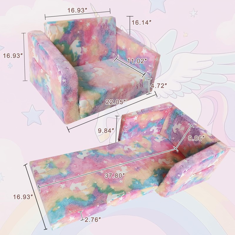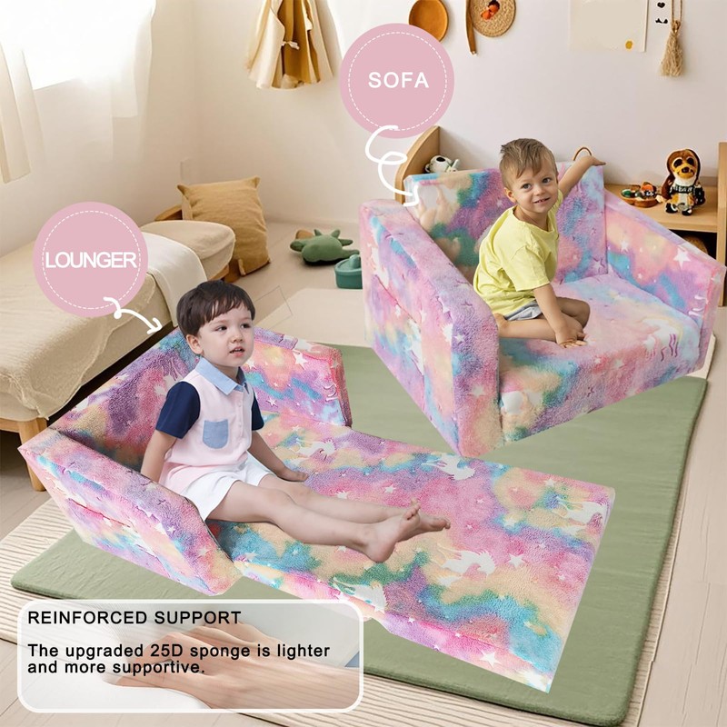 - GLOW IN THE DARK:This sofa bed toddler chair is designed with light-absorbing material that glows soothingly at night after 20 minutes of daylight. Perfect for camping or dimly lit bedrooms, this light-up fabric enhances safety and sparks the imagination at the same time.