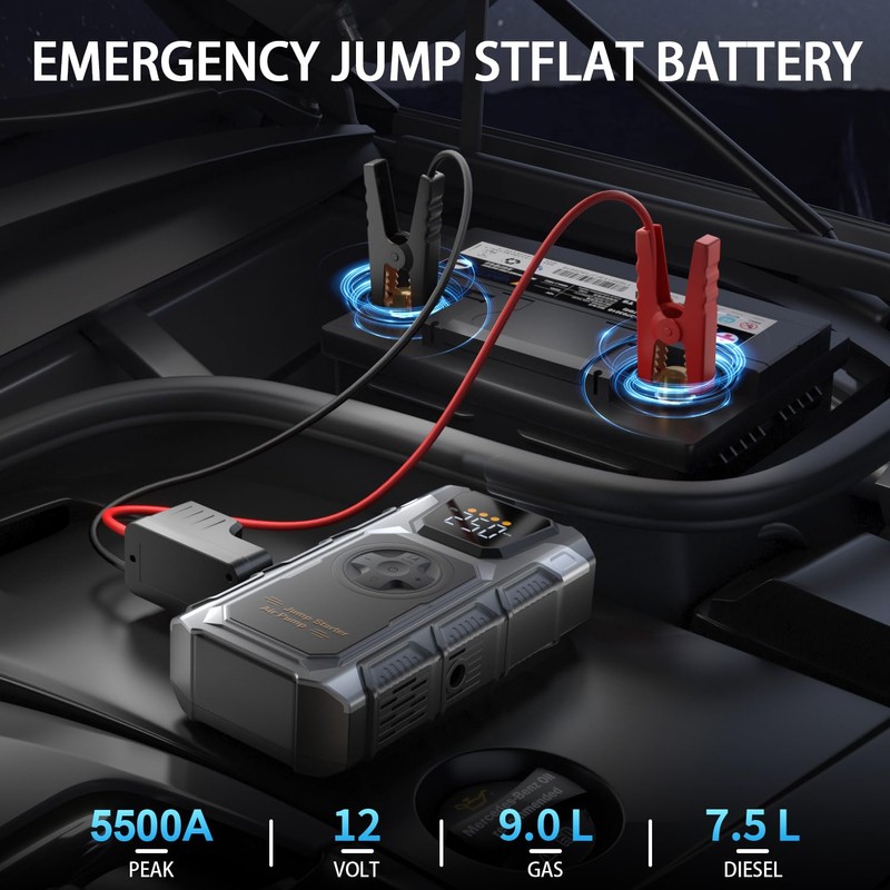 - Powerful Car Battery Jump Starter: This 5500A car battery jump starter can quickly start 12V cars in a temperature range of -4 to 158°F, suitable for 9.0L gasoline/7.5L diesel engines. Whether it is a car, truck, SUV, motorcycle, lawn mower or boat, etc. The multi-functional combination allows you no longer need to worry about car jump start failure or flat tires requiring roadside assistance, even in an emergency, you can easily handle it yourself.