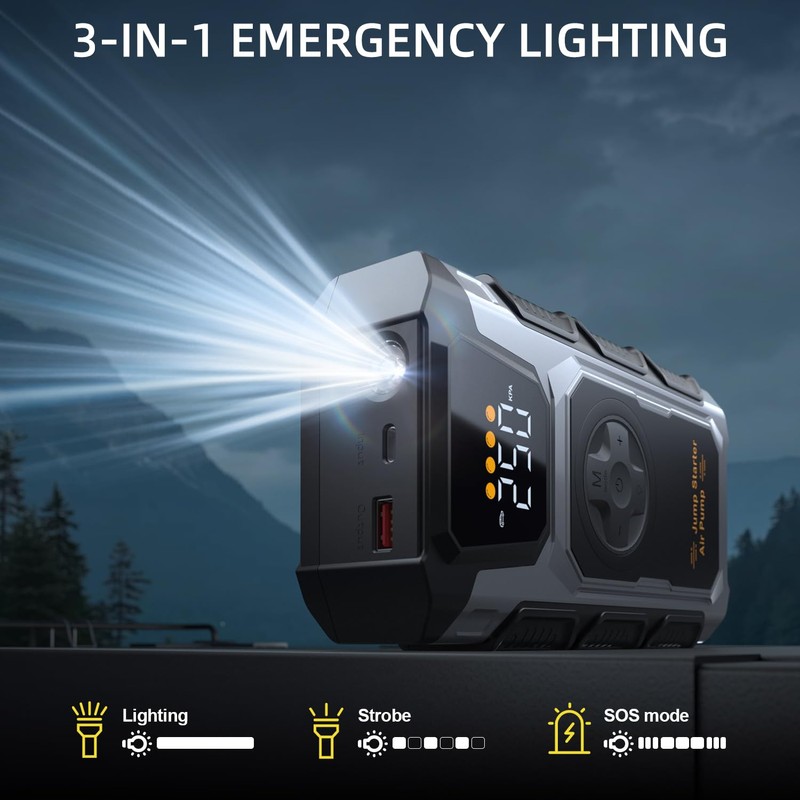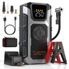 - Car Jump Starter with Air Compressor and Tire Inflator: The battery jumper has tire pressure monitoring and automatic shut-off functions, and can preset 4 inflation modes to provide fast and safe inflation services for items such as car/motorcycle/bicycle tires/mattresses/swimming rings. The inflation pressure is up to 150 PSI, supports three optional units (PSI/KAR/BAR) switching, and the LCD screen can clearly display information such as battery power, inflation mode and real-time tire pressure.
