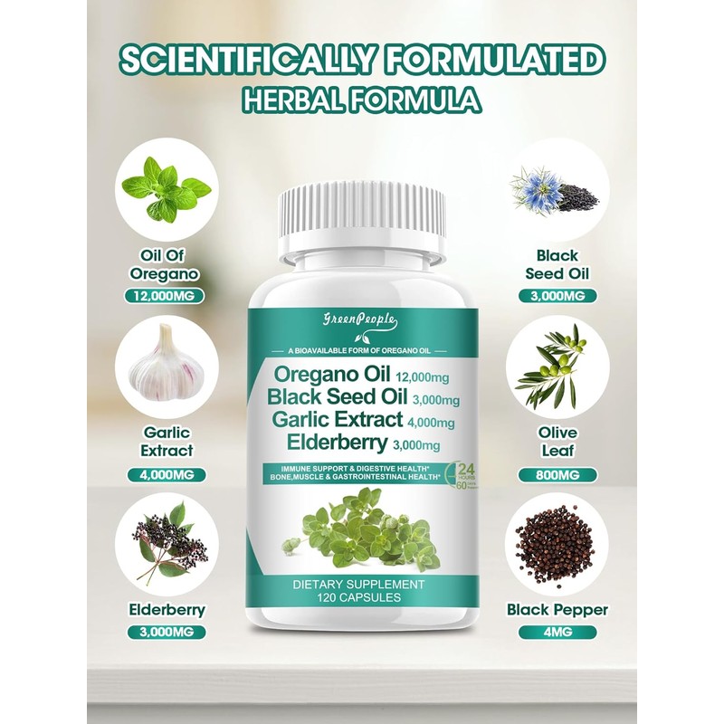- Herbal complex supplement - Abandoning the previous single formula with only oregano oil, GREENPEOPLE not only adds garlic extract and black seed oil, but also combines elderberry, olive leaf, black pepper, coptis chinensis, quercetin and pineapple extract, which effectively improve bioavailability and absorption rate. Only one aceite de oregano supplement can meet all your needs