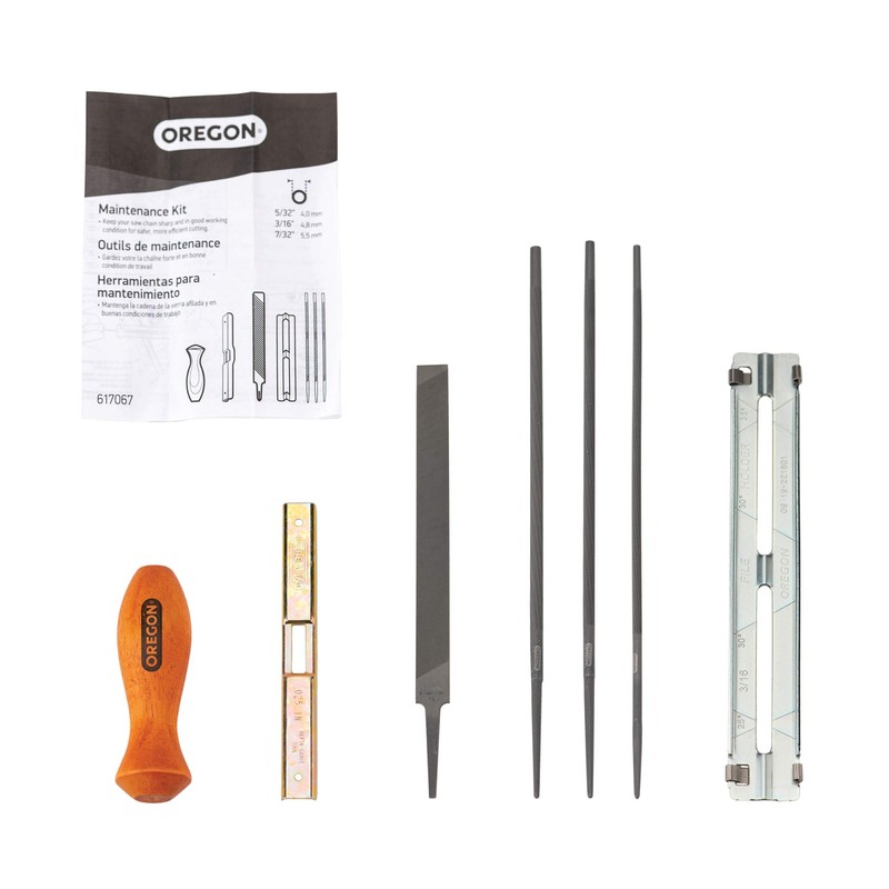 - Comprehensive kit includes 1 x 5/32 Inch (4.0 mm) round saw chain file, 1 x 3/16 Inch (4.8 mm) round saw chain file, 1 x 7/32 Inch (5.5 mm) round saw chain file, 1 x 6 Inch flat file, 1 x file guide, 1 x universal file handle and instruction sheet