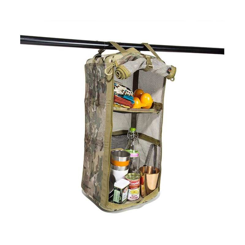 - A vertical storage shelf and camping shelf for hanging storage. The divider can be changed to 1 to 3 rooms depending on the storage content, and the thickness is only 3.1 inches (8 cm). When you close the front shade, you can also use it as a mosquito net. Convenient for storing washed dishes, leftover foods and more. A convenient item that can be used around the kitchen or in a tent