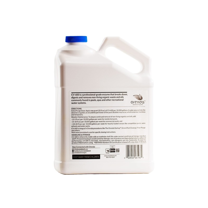 CV-600 Enzyme Water Cleaner is a unique, stabilized enzyme that effectively breaks down and digests non-living organic waste and oils in water. Routine use of CV-600 will positively maintain water clarity, directly address carbon-based contamination, and boost chemical efficiency. For dosing instructions, visit: https://ask.orendatech.com/knowledge/how-to-use-cv-600-and-cv-700