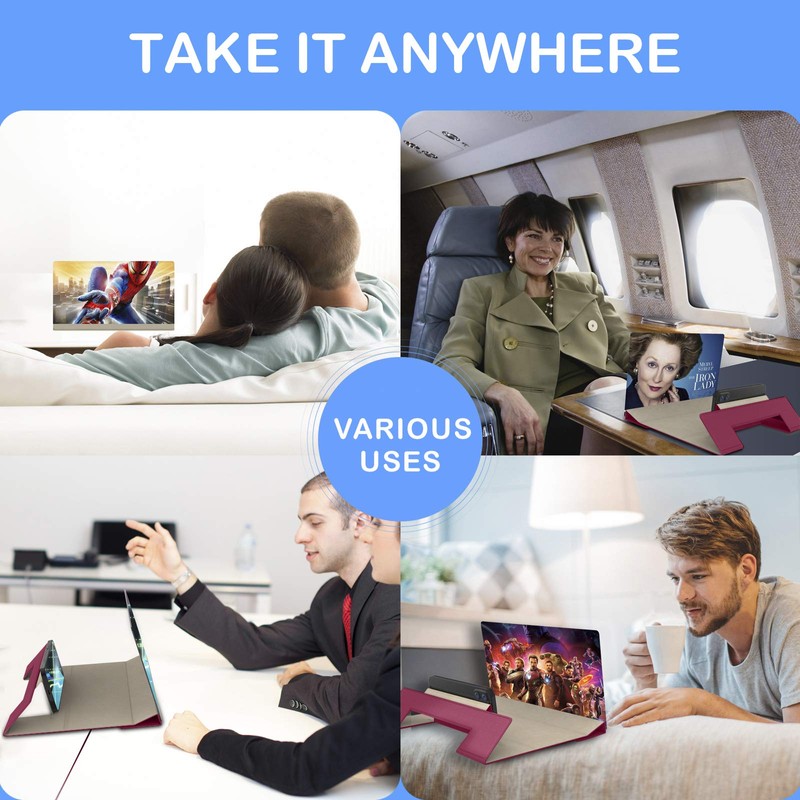 ORETECH Phone Screen Magnifier, 12" 3D Foldable Smart Phone Screen Amplifier Enlarger Leather Phone Holder Stand for All SmartPhone - Red