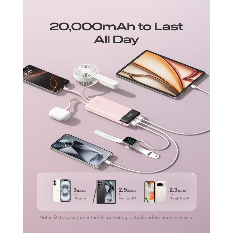 - Double the Capacity, JUST 35% HEAVIER: With twice the capacity of standard power banks, this 20,000mAh portable charger with built-in cords powers an iPhone 16 up to 3 times, Galaxy S24 up to 2.9 times, and Google Pixel 9 up to 2.3 times, perfect for weekends away, business trips, or vacations.(Note: This 77Wh power bank complies with airline carry-on regulations for batteries under 100Wh and must be placed in carry-on baggage.)