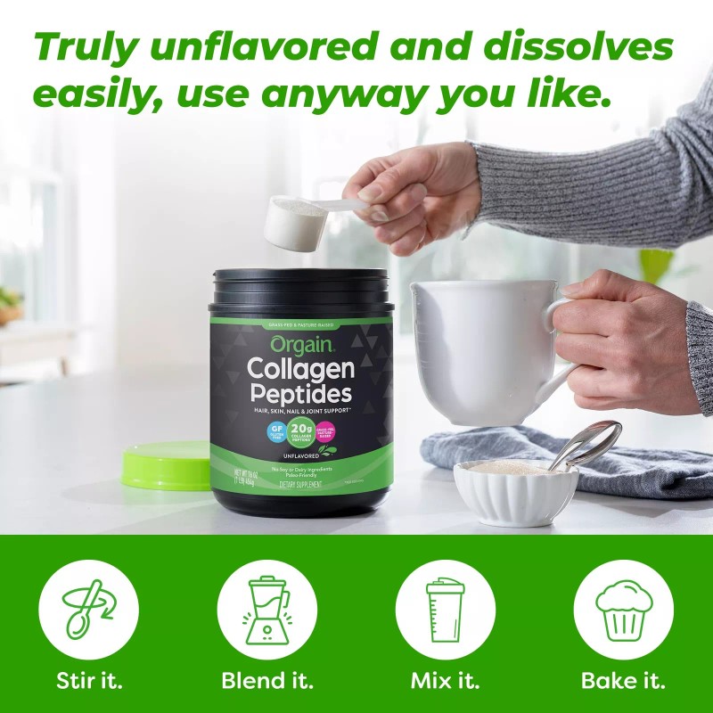 Why collagen, you ask This ever-so-important protein is the most abundant protein in our bodies! It’s a key structural component of our joints, skin, tendons, muscles, and more. Why then, if it’s so prevalent, should you supplement Well, like many good things, it’s doesn't last forever. As we age, our collagen levels begin to decline. This process begins in our 20’s and ramps up with time. A daily collagen replenishment is the key to feeling your best - inside and out! These magical grass-fed collagen peptides put the pep in your step, supporting strong nails, joints, and radiant skin and hair.^ Orgain Collagen Peptides are made with high quality, grass-fed and pasture-raised Type I and III collagen. Plus, with no artificial preservatives, allergens, gluten, dairy, wheat, or eggs, you can bet it’s clean. Orgain Collagen is odorless and unflavored making it easy to incorporate into your daily routine. Enjoy a couple scoops in your morning cup of coffee, your next bowl of oatmeal, a delicious smoothie, or even a batch of cookies! Orgain Collagen can be used in hot or cold foods and drinks, and prepped any way you fancy – stir it, blend it, mix it, bake it! Feel, move and look your best with Orgain collagen. ^These statements have not been evaluated by the Food and Drug Administration. This product is not intended to diagnose, treat, cure, or prevent any disease.