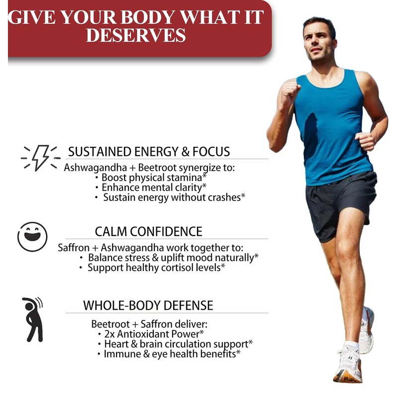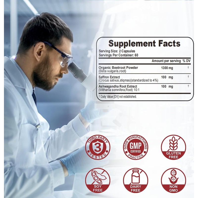 | Ingredients: | Organic Beetroot Powder, Saffron Extract, Ashwagandha Root Extract |