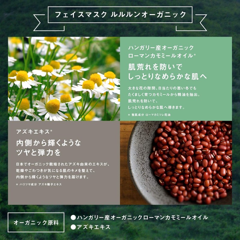 - Lulululun Organic Chamomile: Roman Chamomile has been a valuable herb for women since the ancient times. The history dates back almost 4,000 years ago, and is also known as the oldest herb in Europe. The facemask is formulated with carefully selected organic roman chamomile oil from Hungarian and 2 Azuki extract to protect your skin and enhance its firmness. (*1 Skin shaping ingredient, Roman Kamitree petroleum *2, firmness ingredient, Azuki seed extract