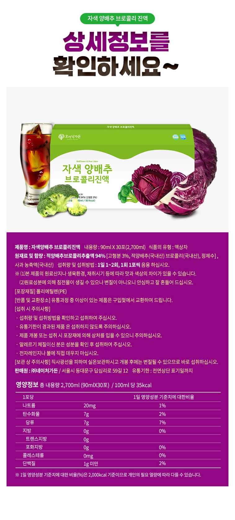 - Name and content of raw materials: Red cabbage broccoli extract (solids 3%, red cabbage (domestic) broccoli (domestic), purified water) 94%, apple concentrate (domestic) 6%