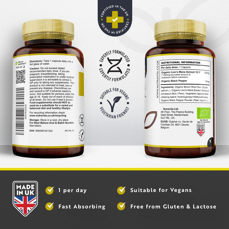- ✔ WHY NUTRAVITA'S LIONS MANE SUPPLEMENT? - Our Organic Lions Mane Mushroom Supplement provides you with 120 vegan capsules per bottle for a 4 month supply. Our capsules contain 1500mg equivalent of mushroom before extraction, meaning each high strength 12:1 capsule contains 125mg of Organic Lions Mane Extract, with an added 10mg dosage of Organic Black Pepper. The mushrooms used in our supplement are water extracted, unlike many competitors that use synthetic or alcohol extraction solvents.