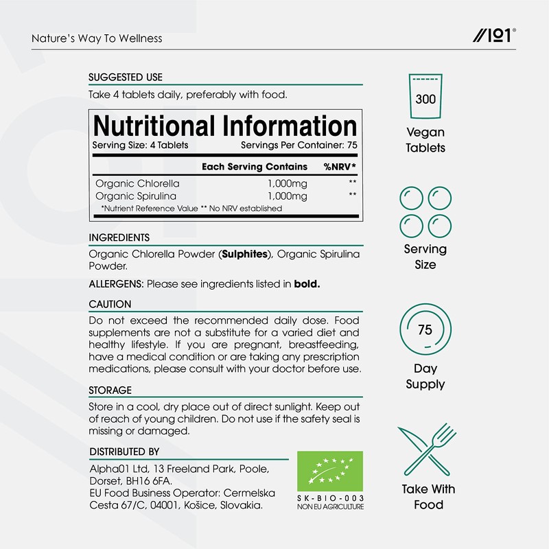 Organic Spirulina & Chlorella 2000mg | 300 Vegan Tablets - Broken Cell Wall | Pure Formula Supplement with No Additives – Certified Organic by Alpha01