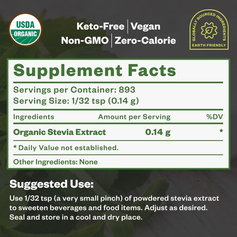 - With 800+ Servings: Our pure stevia is packed with only one ingredient: the extract from stevia leaves. In as little as 1 teaspoon, it delivers a sweet taste without extra additives and sugar. Ideal for baking, coffee, tea, or any beverage.