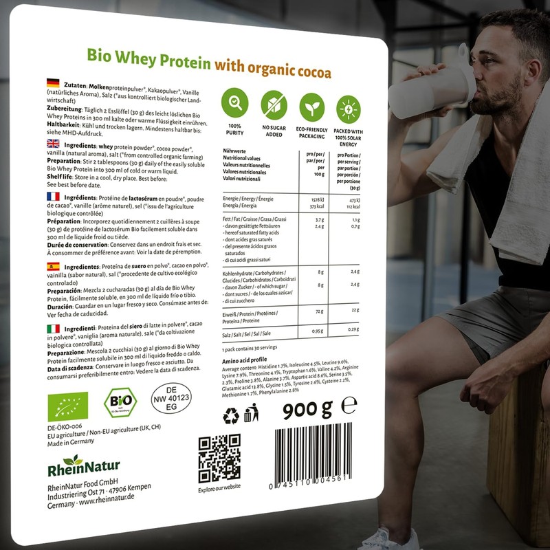 - Delicious cocoa flavour: organic whey protein powder cocoa from RheinNatur is a pure whey protein powder with natural cocoa aroma. The whey is processed without additives such as lecithin and without sweeteners