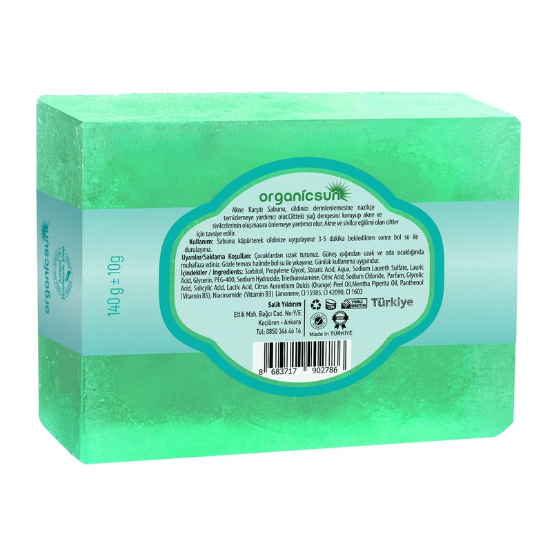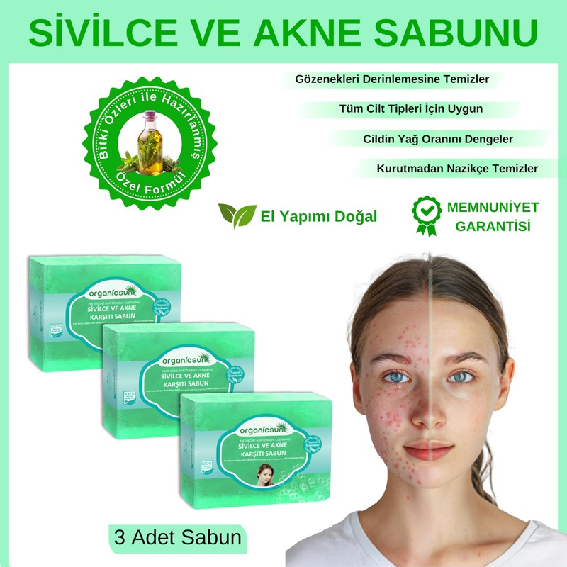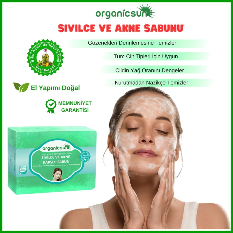 - Organicsun Akne ve Sivilce Karşıtı El Yapımı Sabun ile pürüzsüz ve sağlıklı bir cilde kavuşun! Özenle seçilmiş bitki özleri ve doğal bileşenlerle formüle edilen bu sabun, cildinizin ihtiyaç duyduğu bakımı en iyi şekilde sağlar. Tamamen el yapımı olan Organicsun sabunu, cildinizdeki akne ve sivilce problemlerini hafifletmeye yardımcı olurken, içeriğindeki doğal gliserin sayesinde cildinizi nemlendirir ve besler.