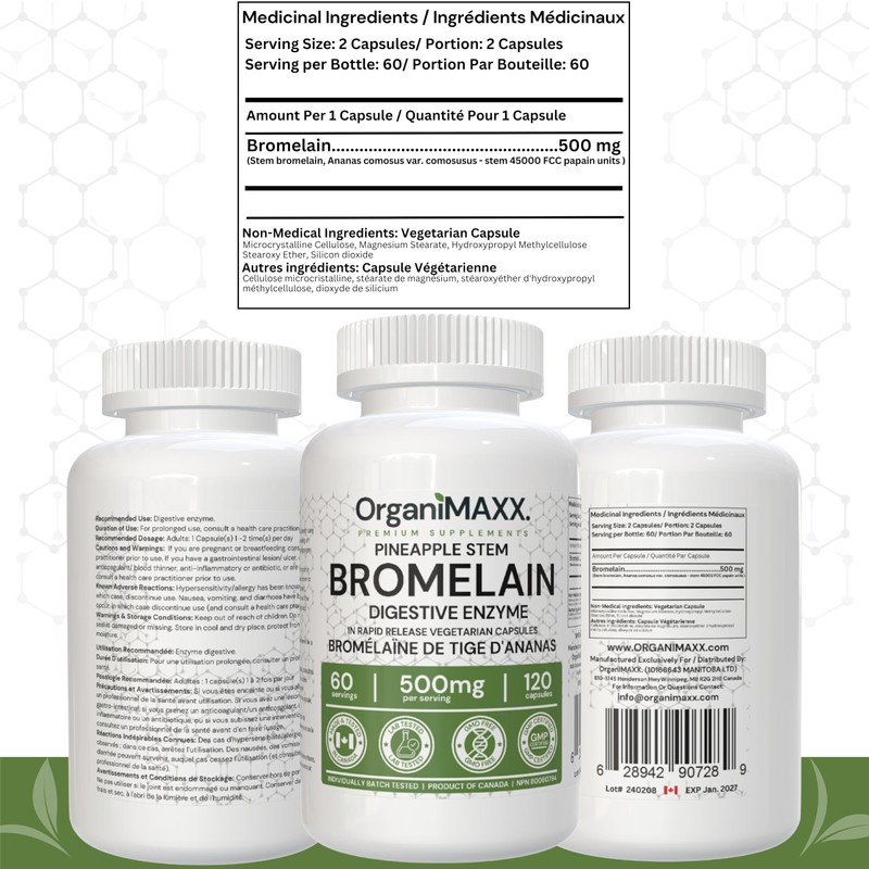 - Premium Natural Blend - OrganiMAXX bromelain 500mg capsules are designed for those who pursue a well-balanced healthy lifestyle, our product offers a plant-based choice to accompany your daily routine, providing a source of natural ingredients to enjoy more energy and aid in the digestive process from every meal while proudly being manufactured in Canada.