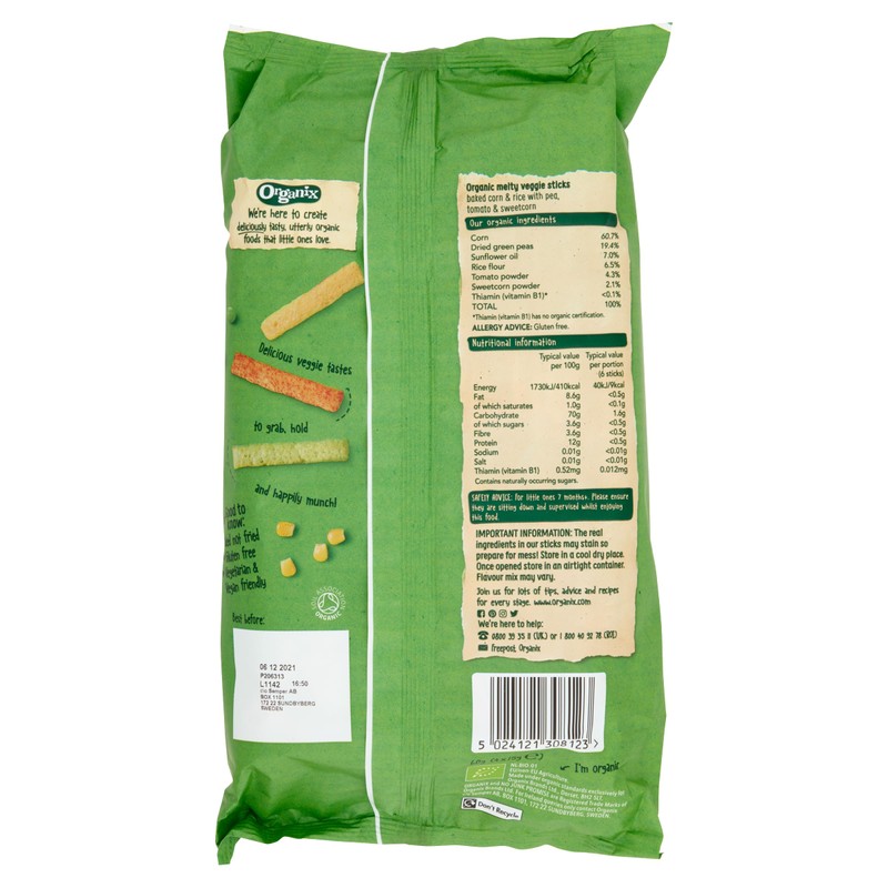 - HEALTHY ORGANIC SNACK FOR KIDS: Organix Melty Organic Veggie Sticks make a scrum-veggily-umptious finger food to grab, hold and happily munch! They melt in the mouth too, for a safe snack flavoured with green peas, sweetcorn and tomatoes. Suitable for 7+ months.