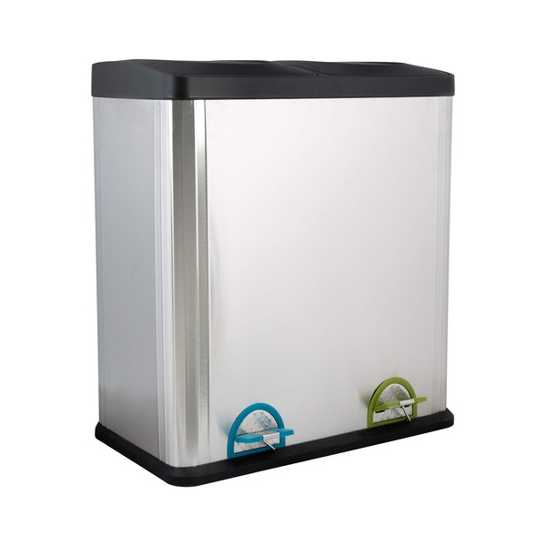 Do your part by recycling without adding any hassle to your day. The Organize It All Neu Home Step-On 16 Gallon Recycle Bin is designed for ease of use. It features side-by-side recycle bins with independent lids, handles and foot pedals. Organize It All Neu Home Step-On 16 Gallon Recycle Bin: Constructed from stainless steel with plastic liners for durability Side-by-side double compartment recycle bin; 16-gallon capacity 16-gallon capacity Details include foot pedals, bucket handles, and independent lids Wipes down for easy cleaning; smaller size and 3-bin version also available **Dimensions:** 23-1/8 inches wide by 13-1/2 inches deep by 25-1/2 inches high **A Closer Look:** Constructed from stainless steel with plastic liners for durability. **Take Care:** Wipes down for easy cleaning.