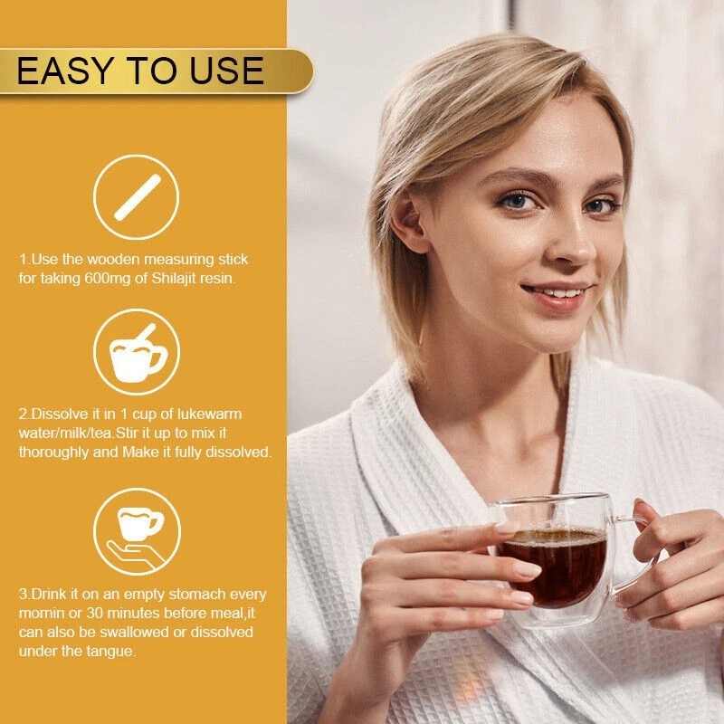 The biggest benefit of Shilajit is that it works with other herbs to enhance its bioavailability and promote the movement of minerals, especially calcium, phosphorus, and magnesium into muscles. Shilajit helps transport nutrients deep into the body's tissues, eliminating deep-rooted toxins. Helps accelerate processes, protein and nucleic acid metabolism, and promotes energy supply responses.