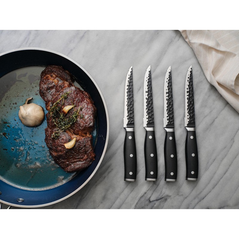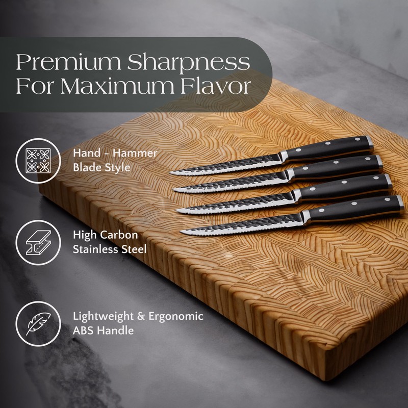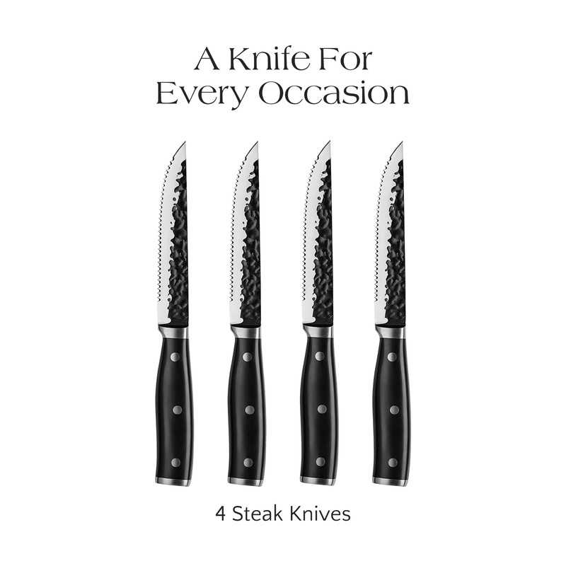 Orgreenic Hammered High Carbon Steel Steak Knives set- Non-Stick Tsuchimi Blade Texture, Ergonomic Handle, Professional Sharpness for Precision Cutting - Includes Chef, Bread and Utility
