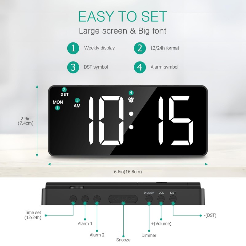 - OPTIONAL 12/24 HOUR TIME FORMAT AND DST: This digital alarm clock has optional 12/24 Hour time format and Daylight Saving Time that meet everyone's need