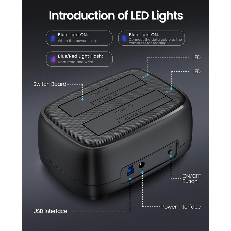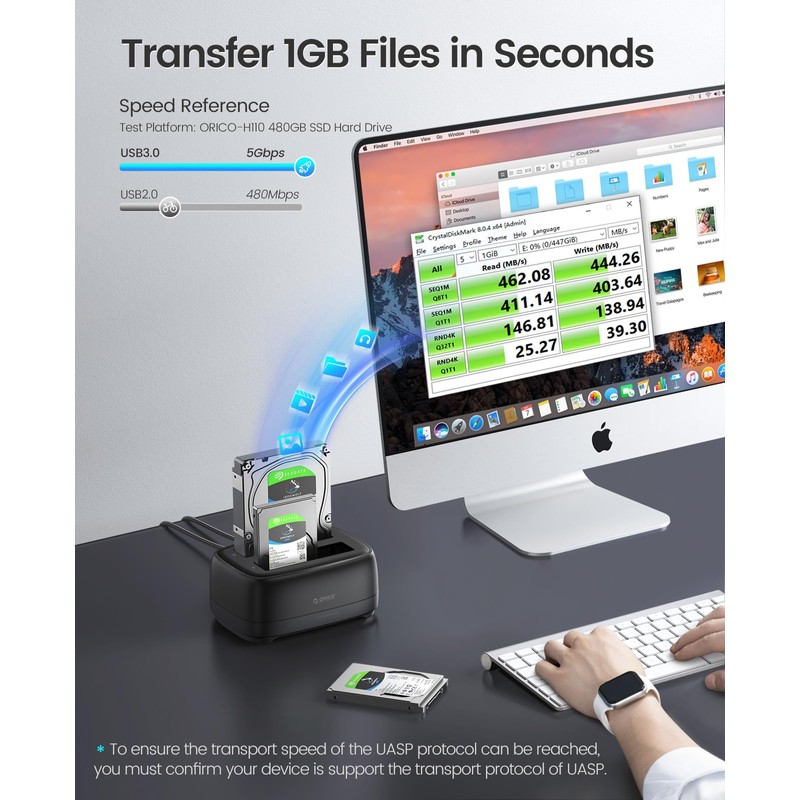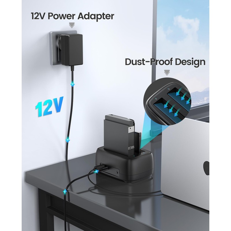 - [UASP supported] The hard drive docking station supports the UASP transfer protocol and achieves transfer speeds of up to 5 Gbps with the USB 3.0 ports. The hard drive docking station comes with a 1 m long USB 3.0 (A-B) data cable and uses a 12V3A power supply for fast and stable operation