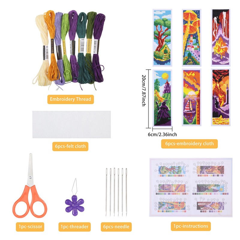 - Complete DIY cross stitch kit: you will receive 6 x cross stitch aida fabric with pre-printed pattern, 6 x backing felt, 19 x colours cross stitch thread, 6 x needles, 1 x threader, 1 x scissors and 1 x English instructions. Complete kit will make 6 cross stitch bookmarks.