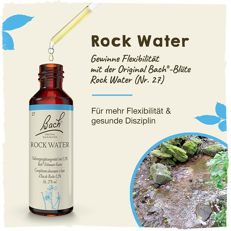 - The matching essence: rock water is number 27 in the system of 38 flower essences defined by the doctor Edward Bach each assigned to a basic state of emotion
