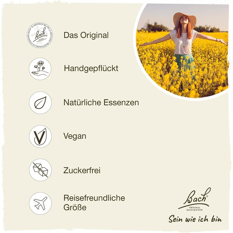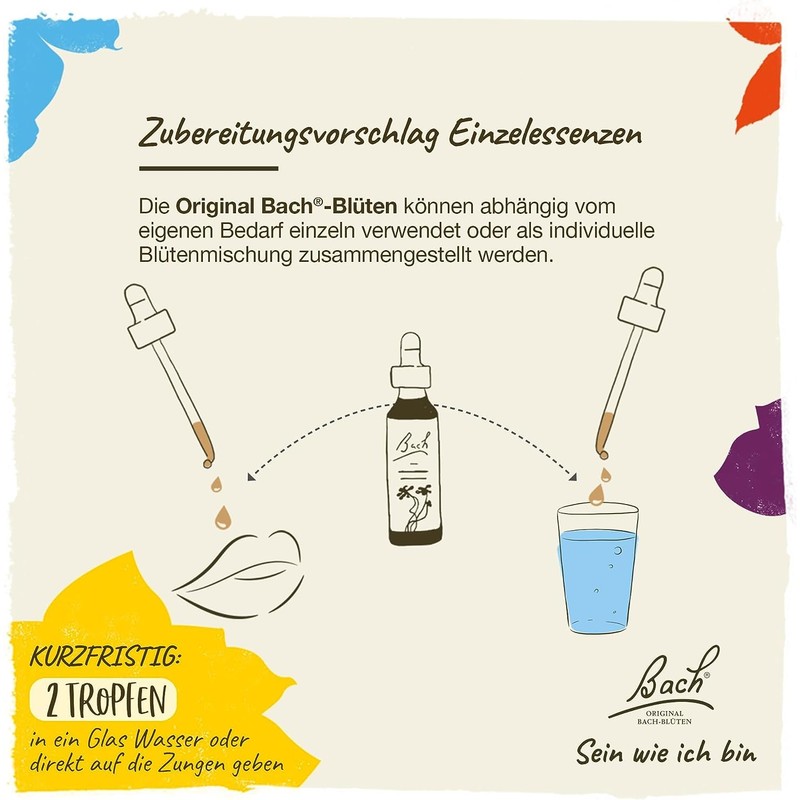 Application: Original Bach flower essences can be taken undiluted or with liquid. Depending on your needs, take a single essence or create your own combination of up to seven different essences with the help of a mixing bottle. Add two drops to a glass of water and drink it gradually. Alternatively, you can put two drops in a 20 ml mixing bottle with still spring water and take four drops at least four times a day.