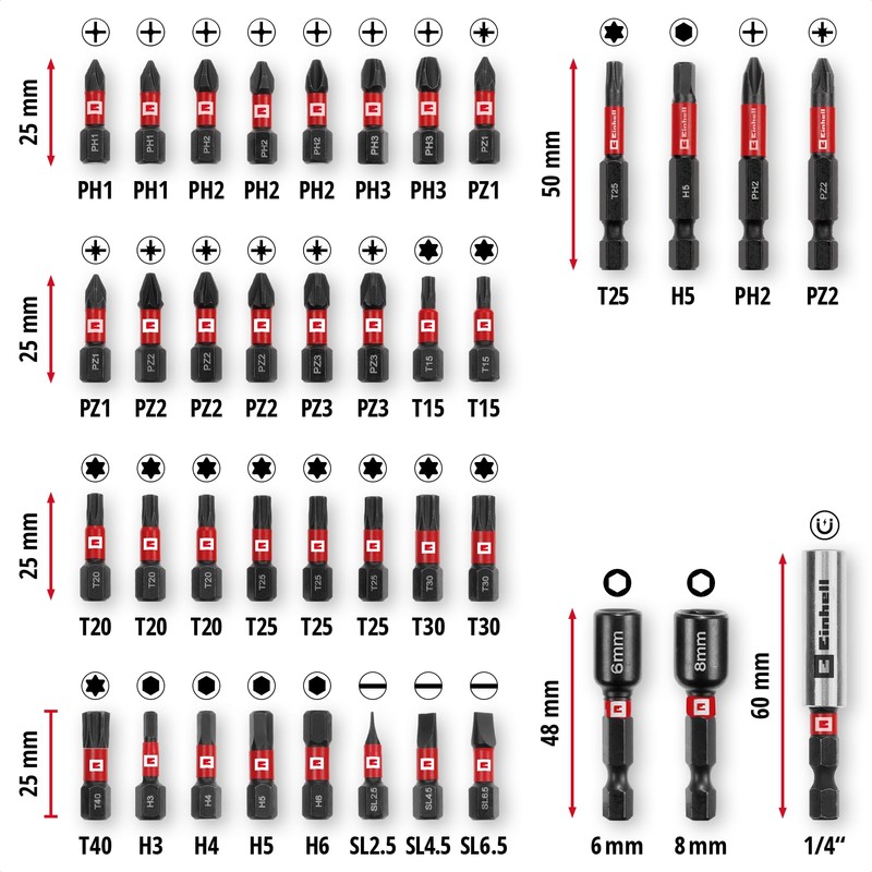 - Impact-resistant bits - The Einhell set includes 25 mm bits with C 6.3 shaft and 50 mm bits with E 6.3 shaft made of manganese-phosphated S2 steel, which impress with their durability.