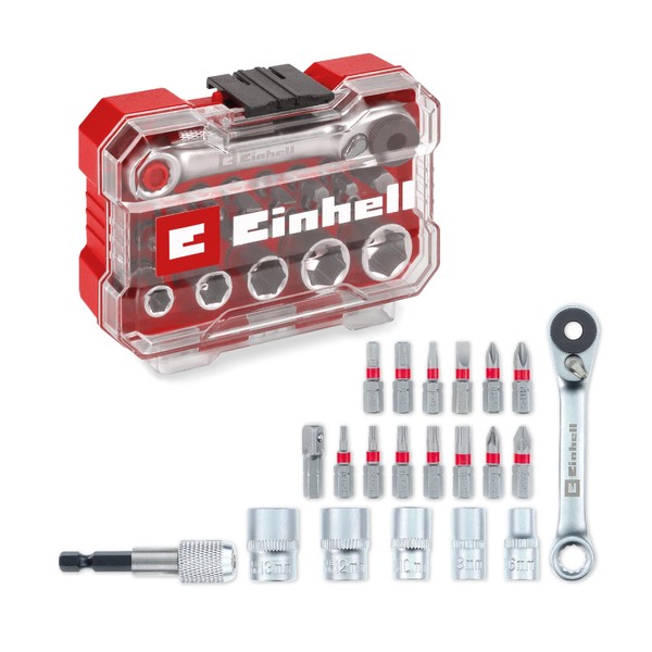 Original Einhell XS-CASE 21-Piece Bit and Socket Spanner Set (25 mm Bits, Socket Wrench, Quick Change Bit Holder, Adapter, Reversible Ratchet with Storage Box)