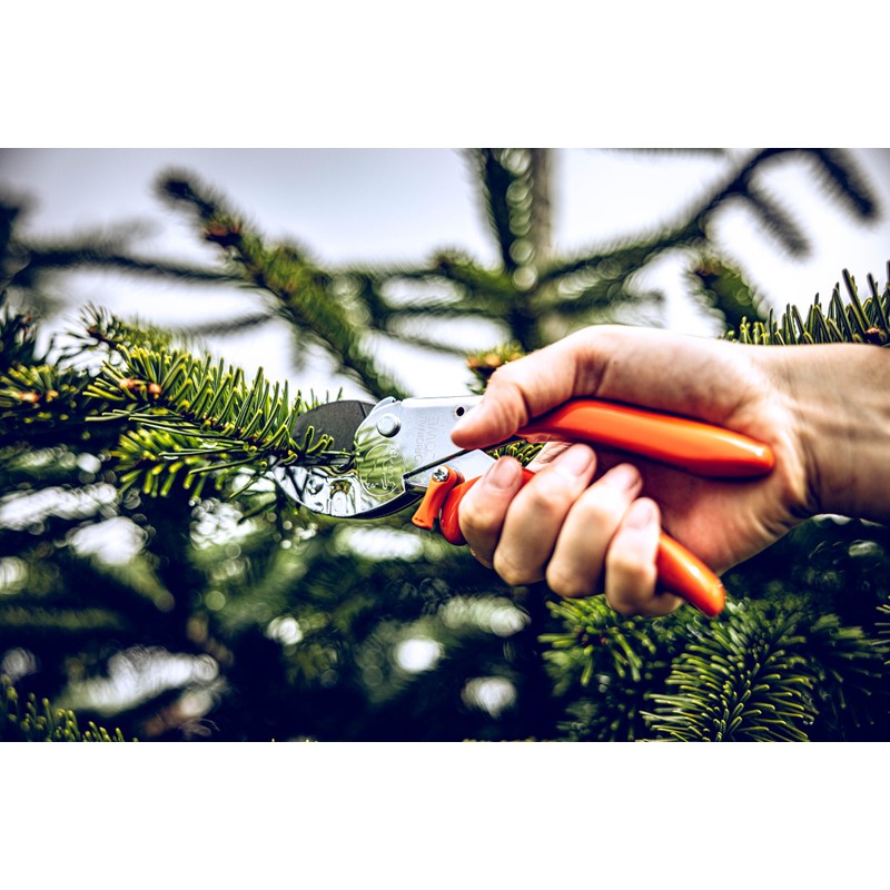 - Thanks to the inward curved lower handle, the ergonomic plastic handles of the 285 g lightweight pruning shears open less far and are therefore particularly suitable for small to medium hands