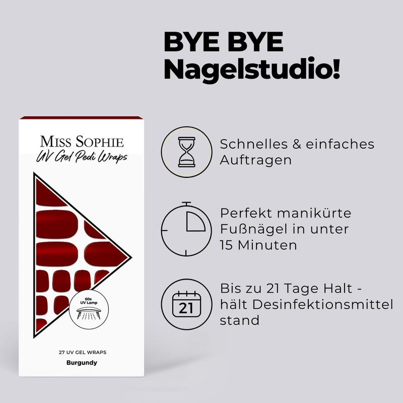 Original Miss Sophie UV Gel Pedi Wraps Burgundy I Nail Foils for UV Pedicure I Pack of 27 UV Gel Pedicure Wraps Plain I Nail Stickers for Toenails I Pedicure Nail Foils