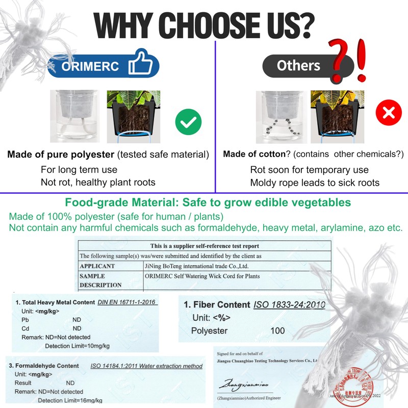 • 【Reusable Wicking Material】– 100 feet long, 1/12 inch in diameter. ORIMERC capillary wick made of polyester fiber, not rot or decay, reusable for years and easy to maintain. The wicking cord not contain any harmful chemicals such as formaldehyde, heavy metal, arylamine, azo etc., PH Value is 6.7, which is the best wicking material for plants watering system.
