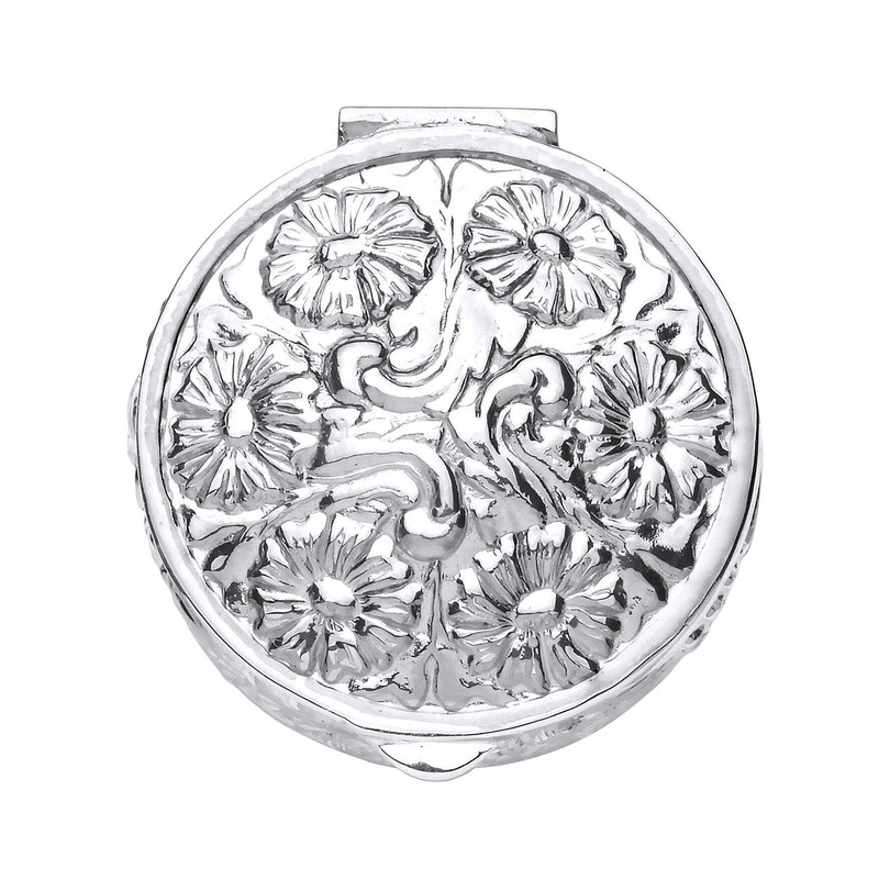 - Ornate Embossed Foliate Pattern Round Pill Box for Women Men - Solid 925 Sterling Silver