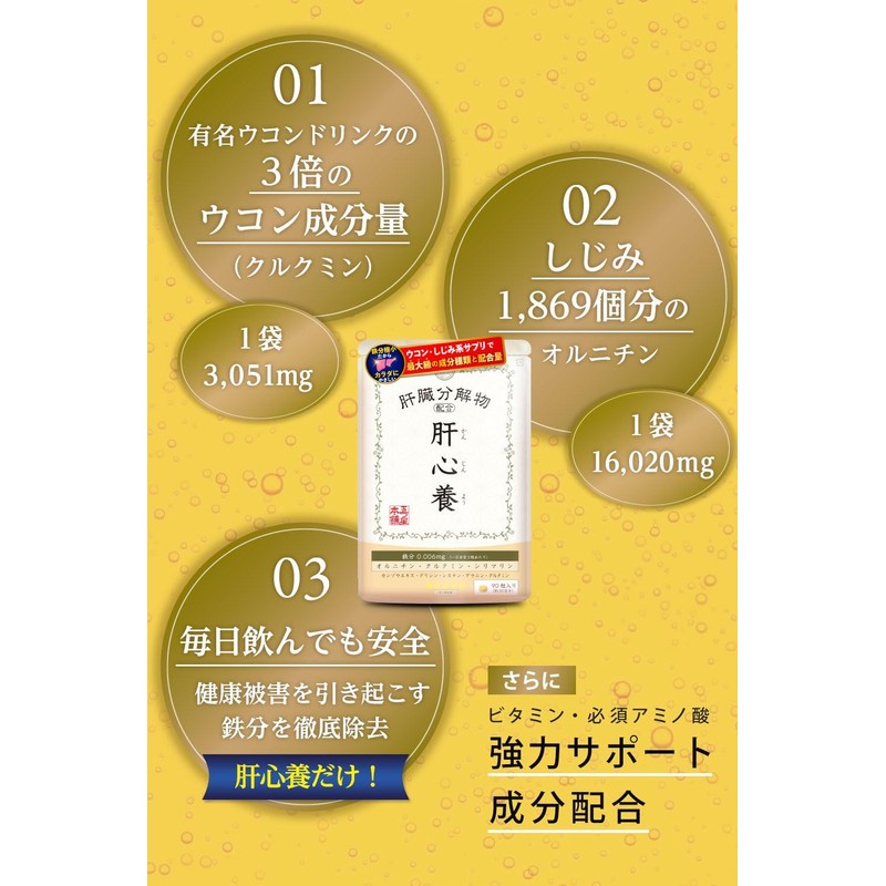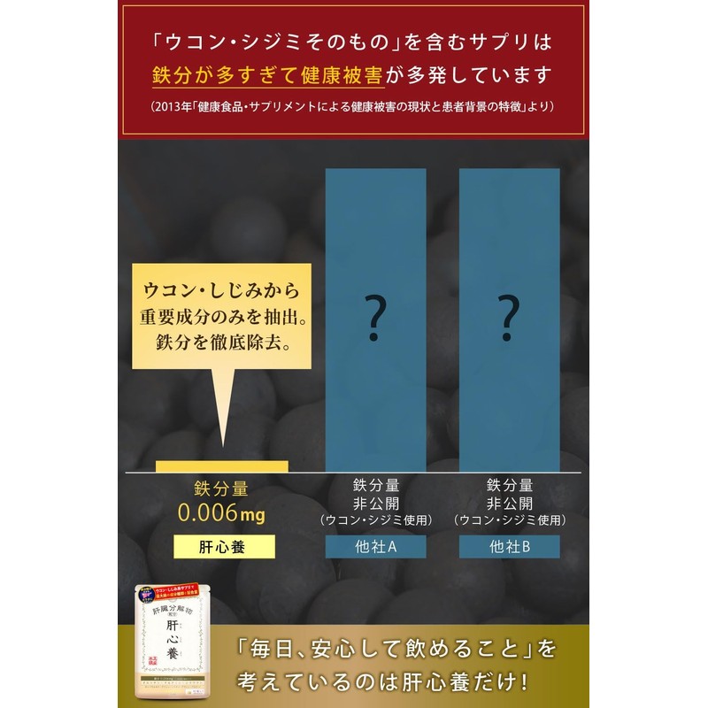 - ✅ [Feature 1: Removes as much iron as possible, which is a concern for health damage] Curcumin instead of turmeric, which is rich in iron. Ornithine instead of clams, which are rich in iron. The iron content of Kanshinyo, which extracts only the important ingredients, is only 0.006 mg per day (in the case of liver disease, a daily iron limit of 6 mg is recommended). Even those who have an upper limit for iron intake or are concerned about the burden can consume it with peace of mind.